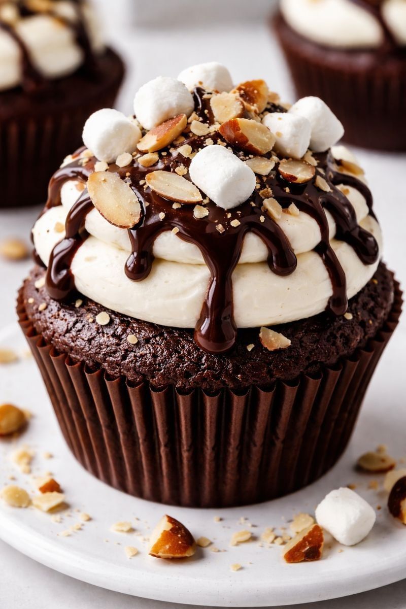 Chocolate almond cake, filled with marvelous marshmallow creme, topped with whipped frosting, chocolate drizzle, and adorned with mini marshmallows and almonds.