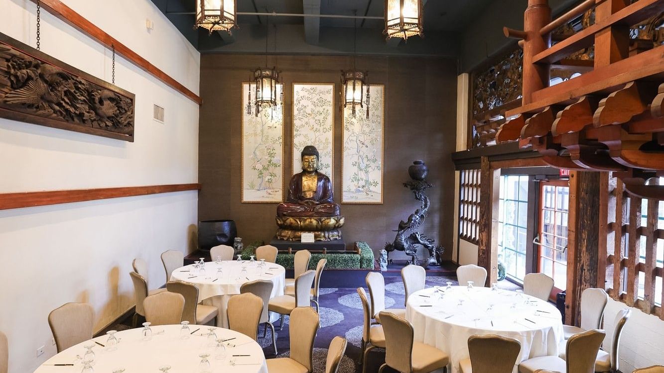 A split-level venue on the 1st floor, the Ho-O-Kan Room showcases Asian-inspired décor, including a traditional wood-beamed ceiling and wrap-around gallery. Notable pieces include an 8.5-foot Tokugawa-period Amitabha Buddha and an 8-foot bronze dragon statue.