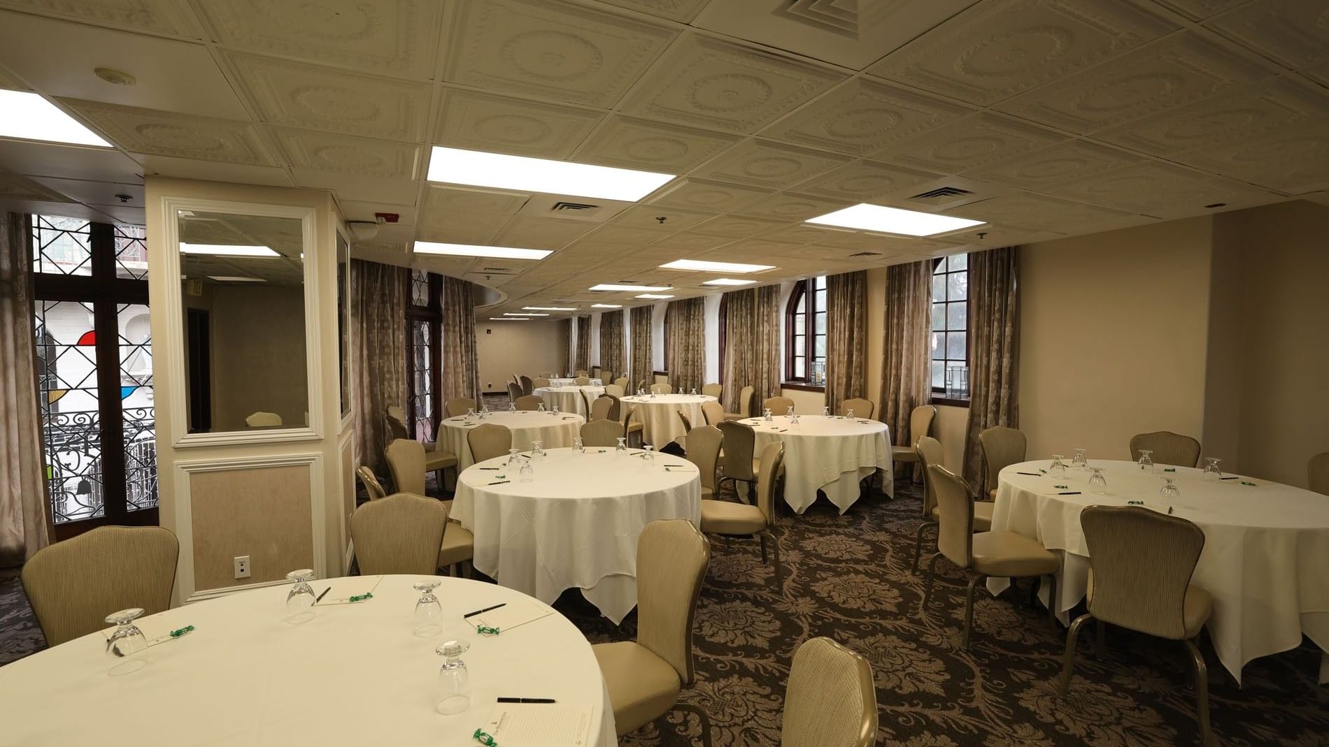Perched on the 3rd floor, the Monterey Room offers floor-to-ceiling windows overlooking the iconic six-story spiral staircase of the International Rotunda. Gilded ceiling tiles and surrounding stained-glass windows create an unforgettable setting.