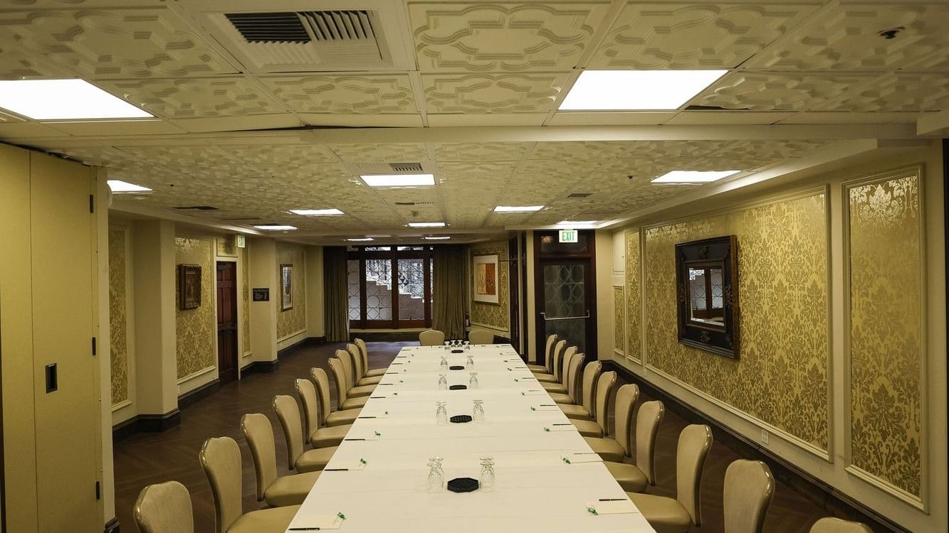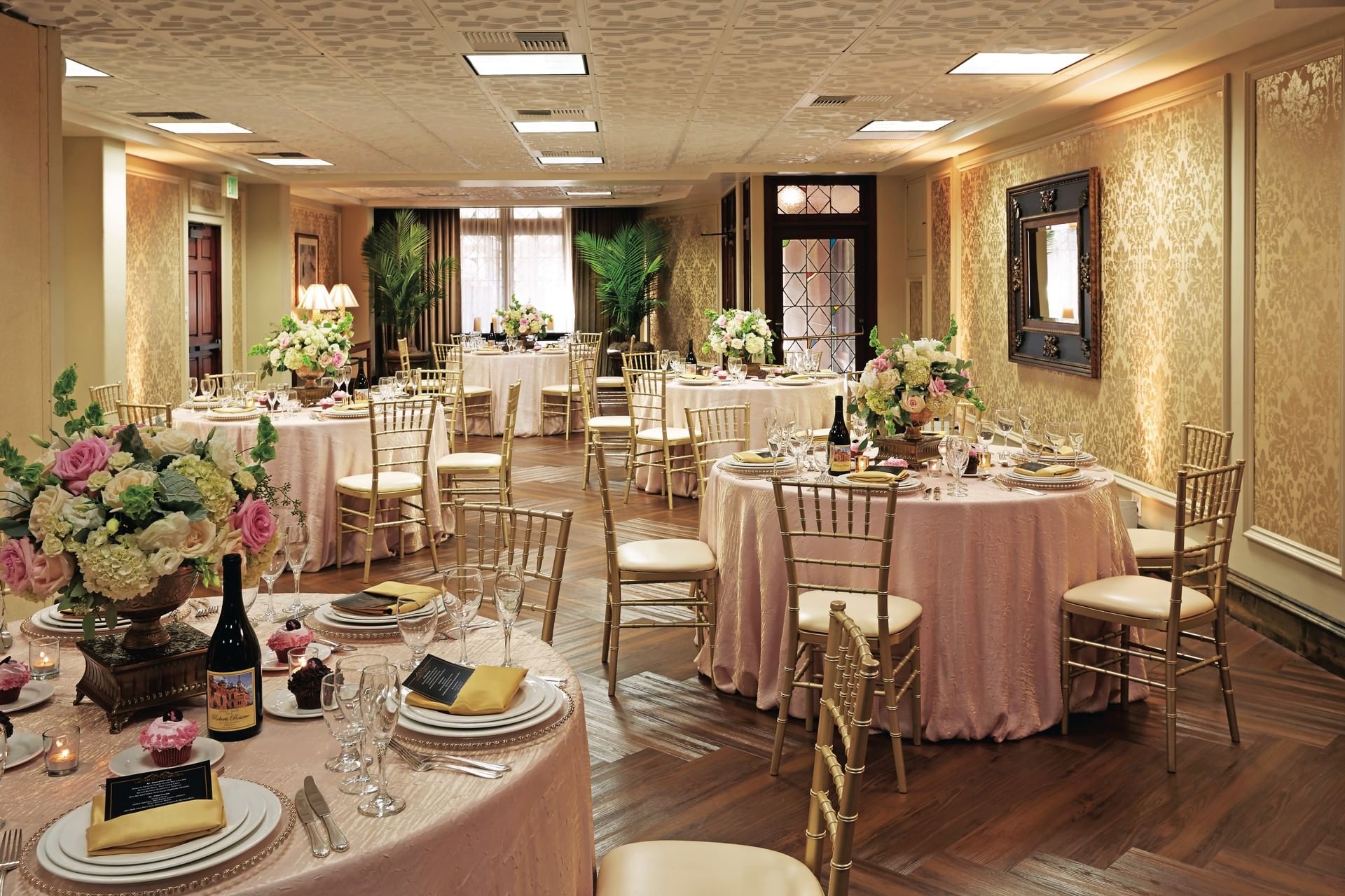 Also on the 3rd floor, the San Diego Room welcomes guests with a bright indoor loggia featuring Spanish arches and wrought iron lanterns. Inside, rich wood-grain flooring and gold damask wallpaper from Europe set a refined tone. The space can be divided for versatility and offers views of the International Rotunda.