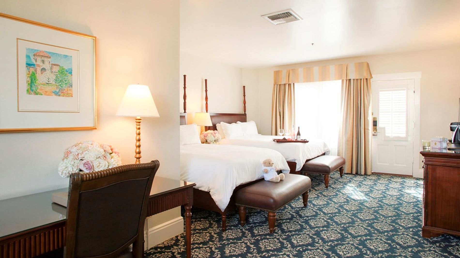Unique architectural details define this spacious Glenwood Room, which features two queen beds and generous natural light. Bathrooms offer marble accents, granite counters, and hand-painted tile floors. Each room in this category offers its own distinct layout and character.
