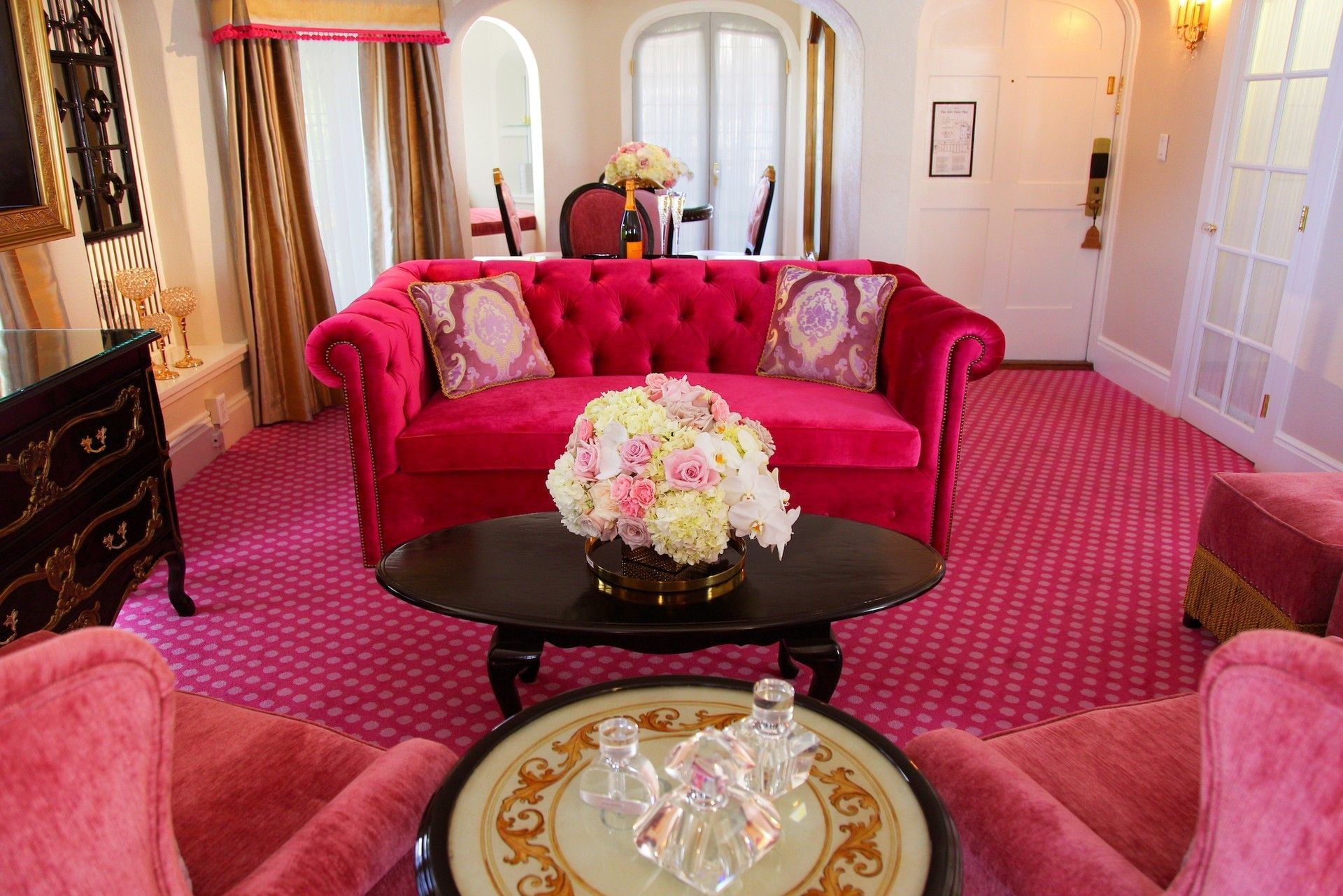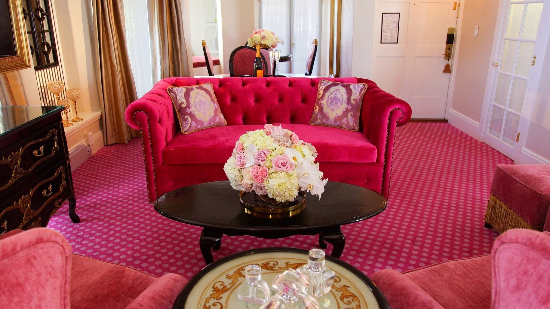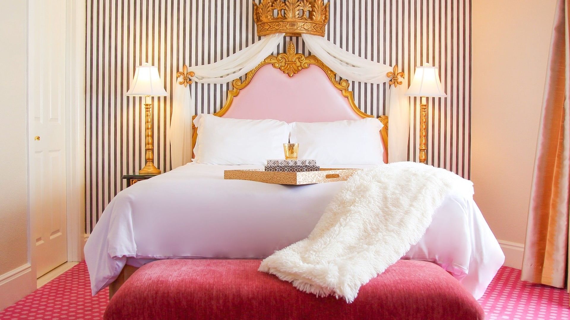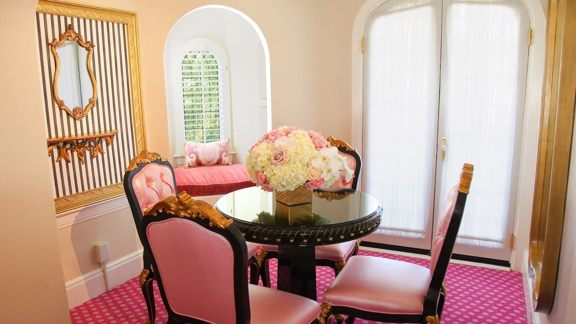 Our Kensington Kelly Suite is a miniature European castle in itself, featuring a royal yet playful ambiance and elegantly decorated in a palette of pinks and gold with striped and polka-dotted accents. A large crown is mounted above the elevated queen bed, and the Chesterfield-style sleeper sofa features rolled arms and a tufted back. The suite also features a sitting area complete with tea set and tiled decorative fireplace, and a perfect reading nook. French doors leading to your own personal patio enclosed by wrought iron fencing. This is the ultimate fairytale getaway for adults and children alike.