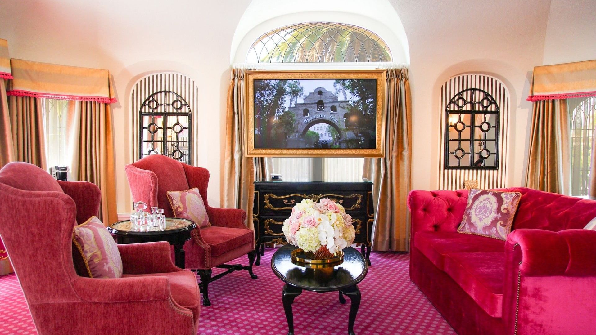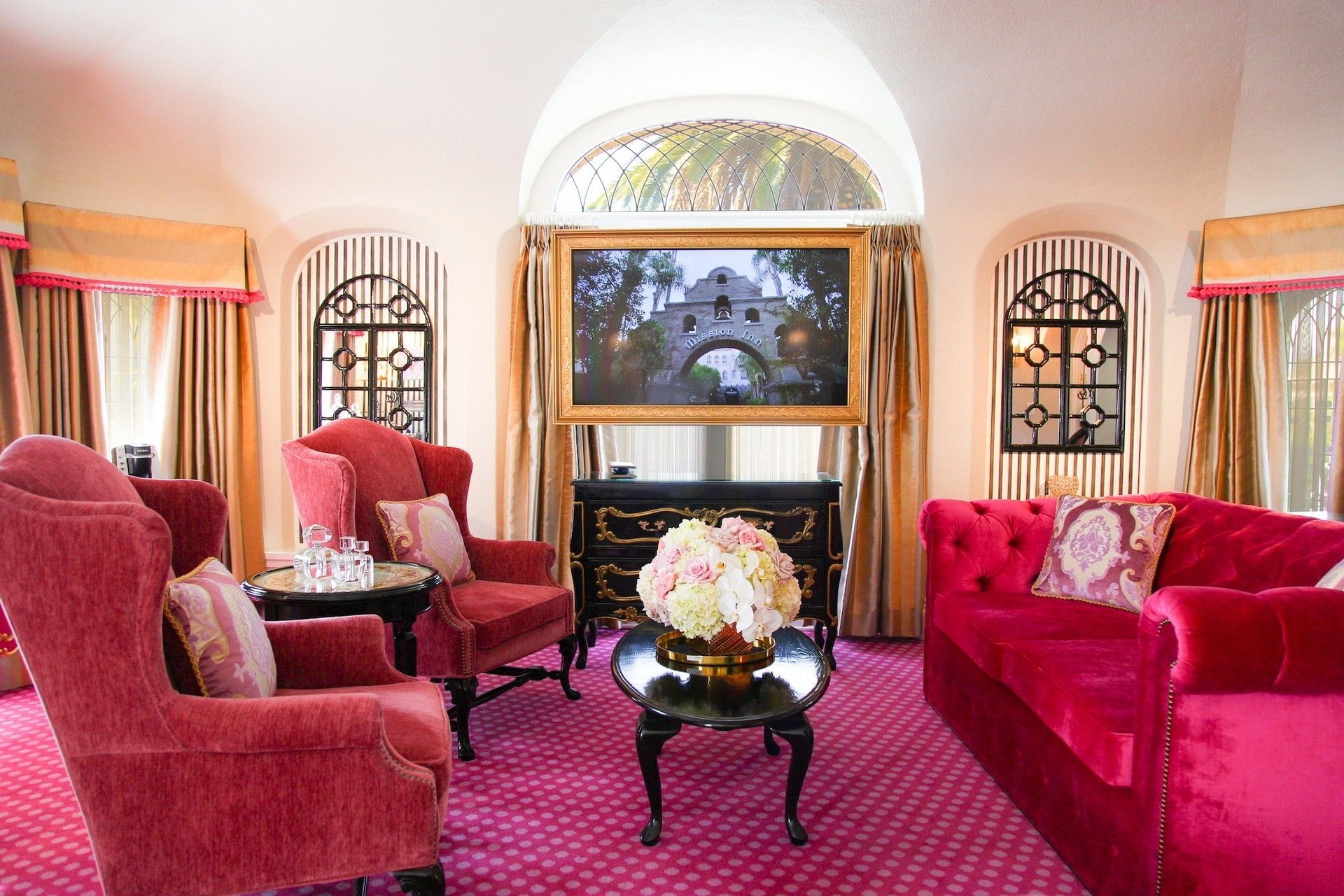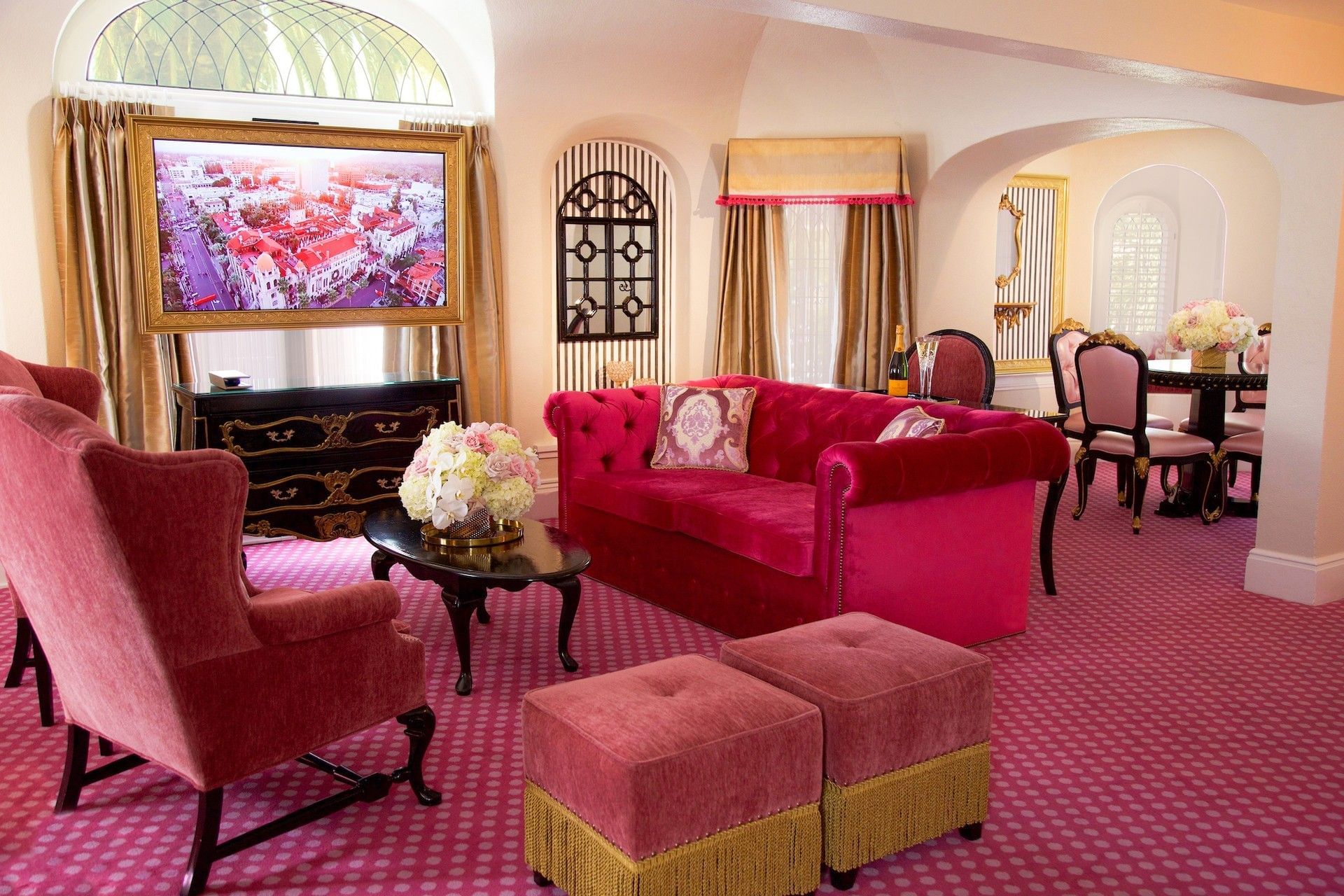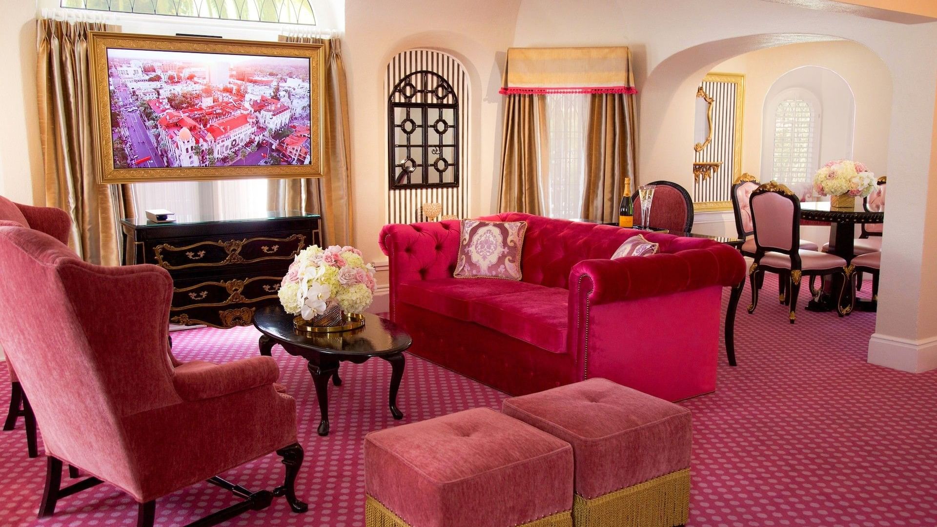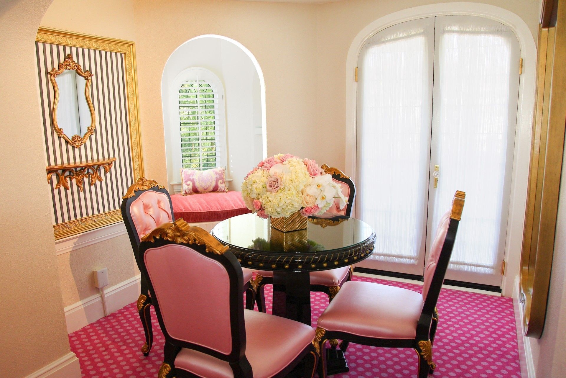 Our Kensington Kelly Suite is a miniature European castle in itself, featuring a royal yet playful ambiance and elegantly decorated in a palette of pinks and gold with striped and polka-dotted accents. A large crown is mounted above the elevated queen bed, and the Chesterfield-style sleeper sofa features rolled arms and a tufted back. The suite also features a sitting area complete with tea set and tiled decorative fireplace, and a perfect reading nook. French doors leading to your own personal patio enclosed by wrought iron fencing. This is the ultimate fairytale getaway for adults and children alike.