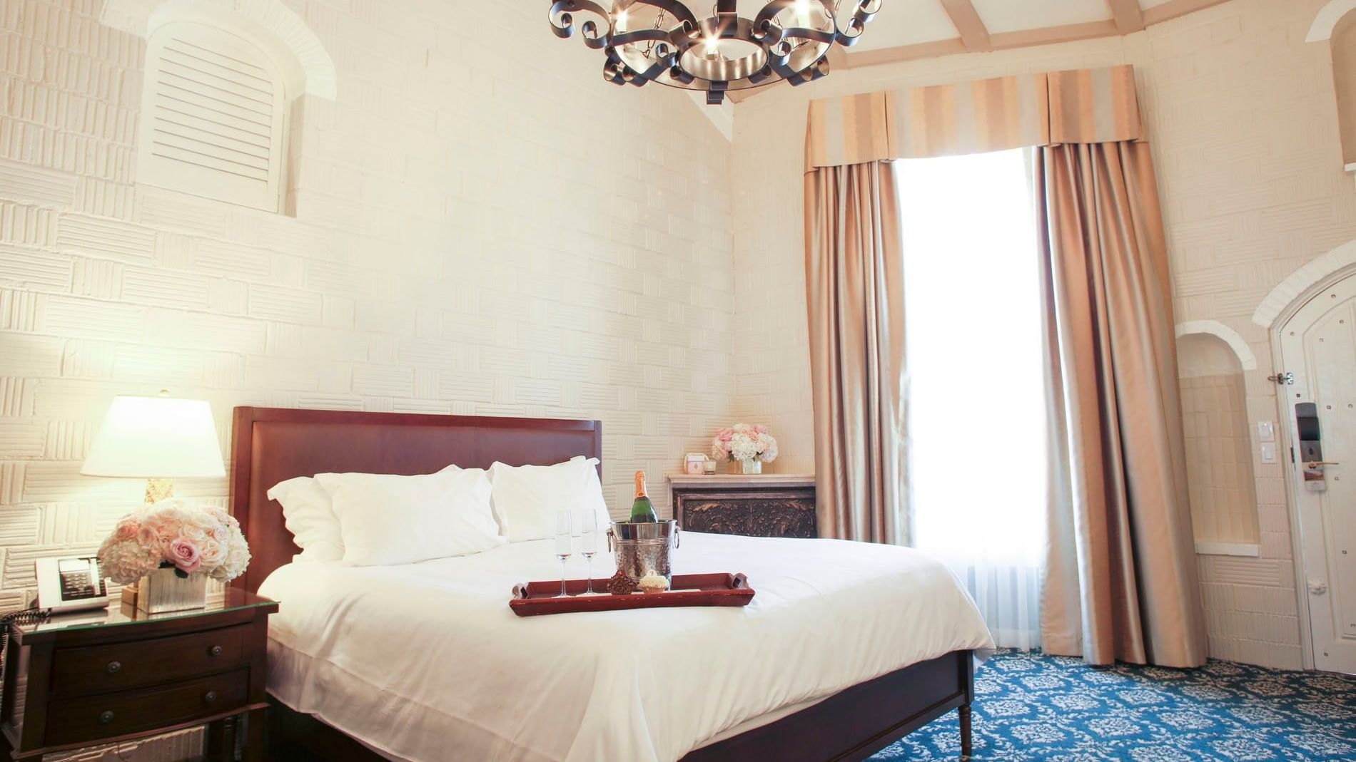 Perched on the top floor, the Mission King offers a grand sense of space and style, complete with a luxurious king bed and breathtaking views of the Spanish Patio, Author’s Row, the Garden of the Sky, or the Alhambra Courtyard. Unique architectural details such as vaulted ceilings, chandeliers, stained leaded glass, and a preserved fireplace add historic charm to this elegant retreat.