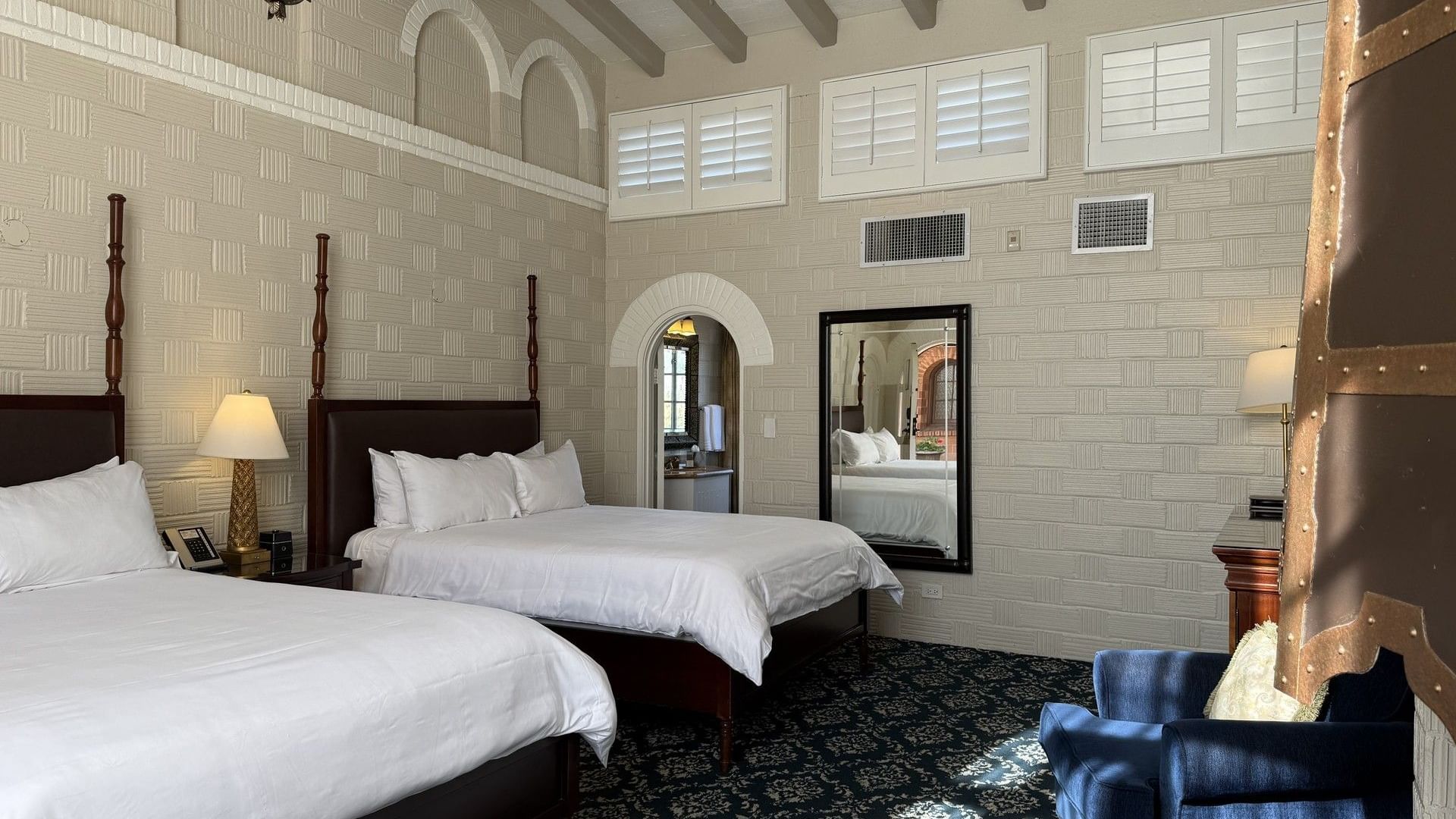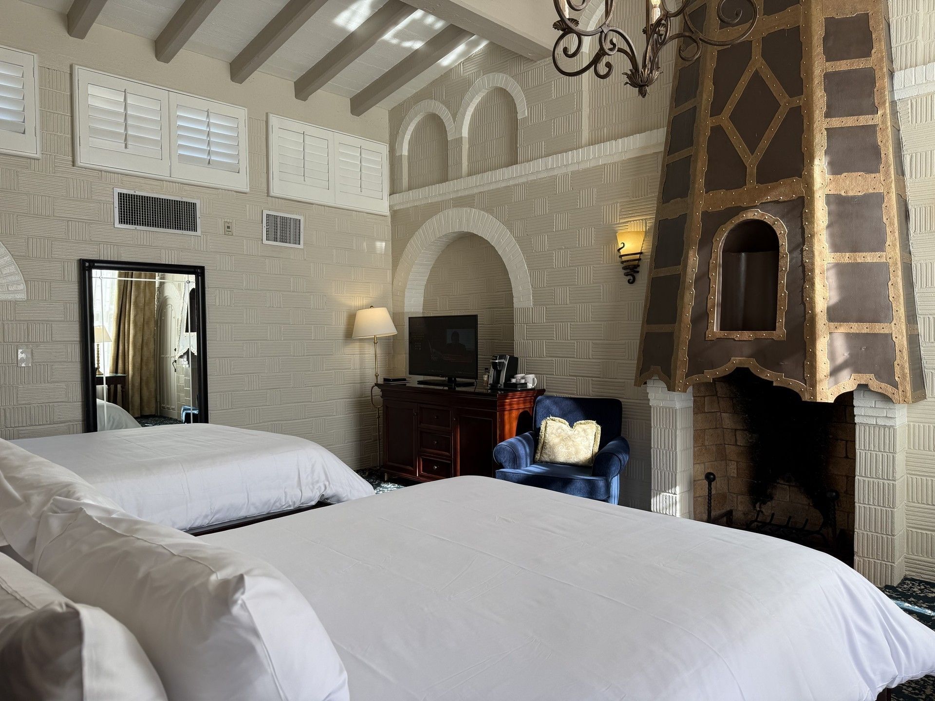 Spacious and beautifully appointed, the Mission Two Queen is located on the top floor and features two queen beds along with sweeping views of the hotel’s most scenic courtyards and gardens. Architectural highlights include vaulted ceilings, decorative glasswork, antique-style chandeliers, and an original fireplace that adds warmth and character.